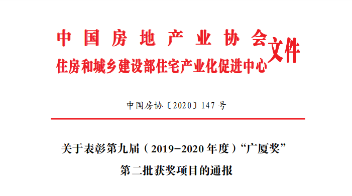 據(jù)了解,“廣廈獎(jiǎng)”是經(jīng)住房和城鄉(xiāng)建設(shè)部批準(zhǔn),由中國房地產(chǎn)業(yè)協(xié)會(huì)、住房和城鄉(xiāng)建設(shè)部住宅產(chǎn)業(yè)化促進(jìn)中心共同設(shè)立的我國房地產(chǎn)開發(fā)項(xiàng)目的綜合性大獎(jiǎng),相當(dāng)于魯班獎(jiǎng)、梁思成獎(jiǎng)、詹天佑獎(jiǎng),代表房地產(chǎn)綜合開發(fā)行業(yè)的最高榮譽(yù)。