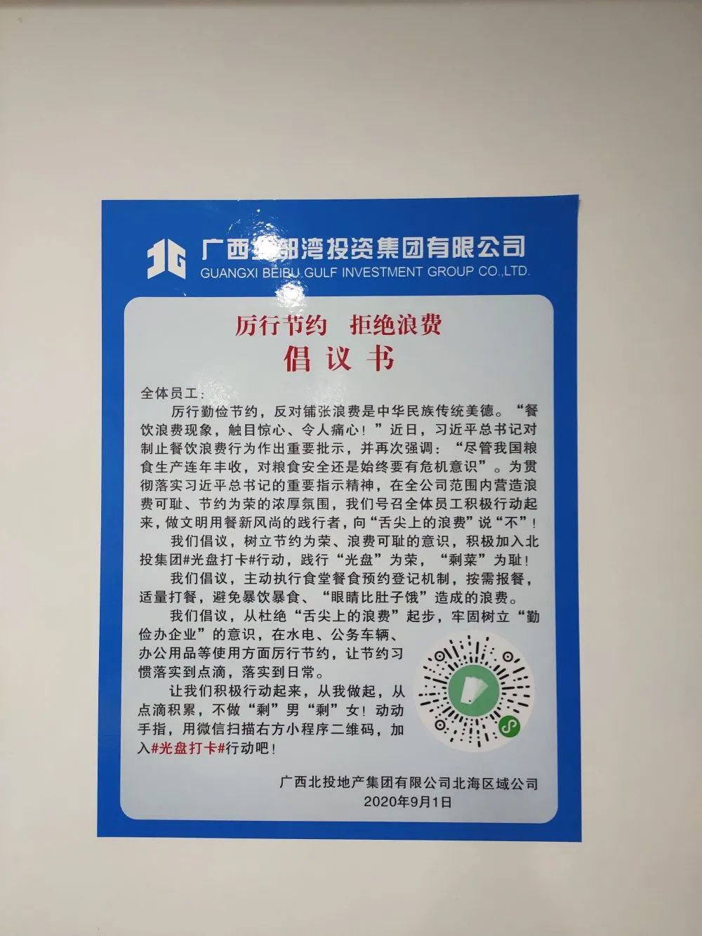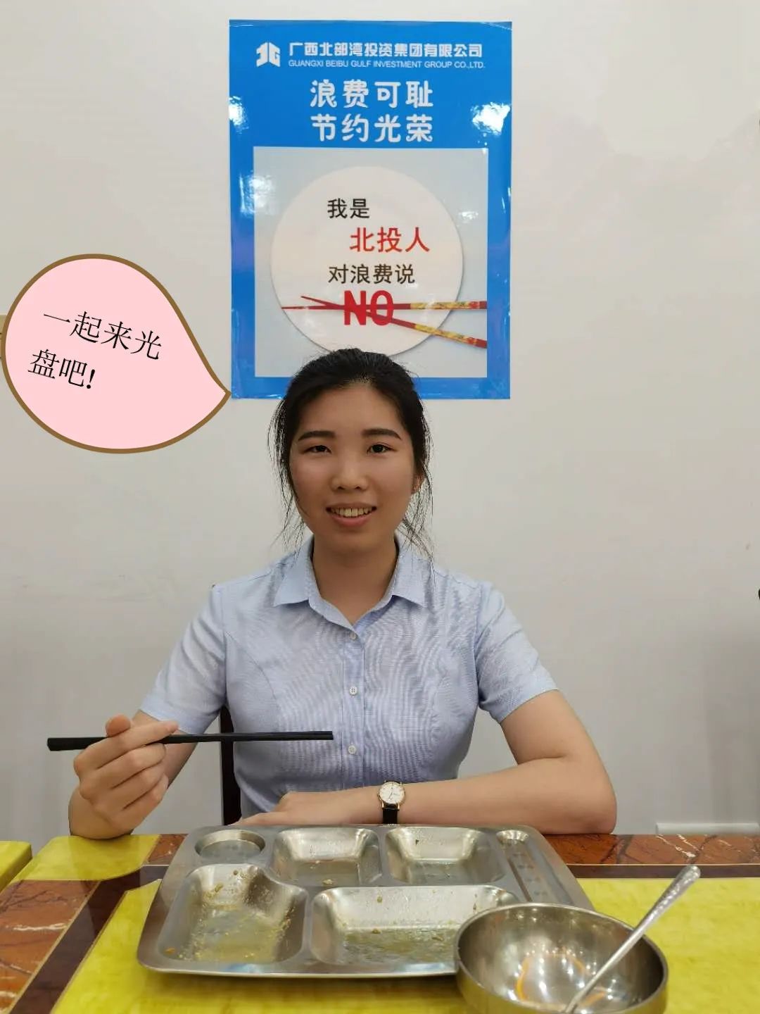 北海區域公司向全體員工發出了“厲行節約,反對浪費”倡議書,號召廣大員工按需訂餐,適量打餐,積極加入北投集團#光盤行動#打卡活動,并在食堂就餐區域張貼海報標語,營造了濃厚的節約氛圍,促使就餐員工耳濡目染,讓“舌尖上的節約”成為習慣。