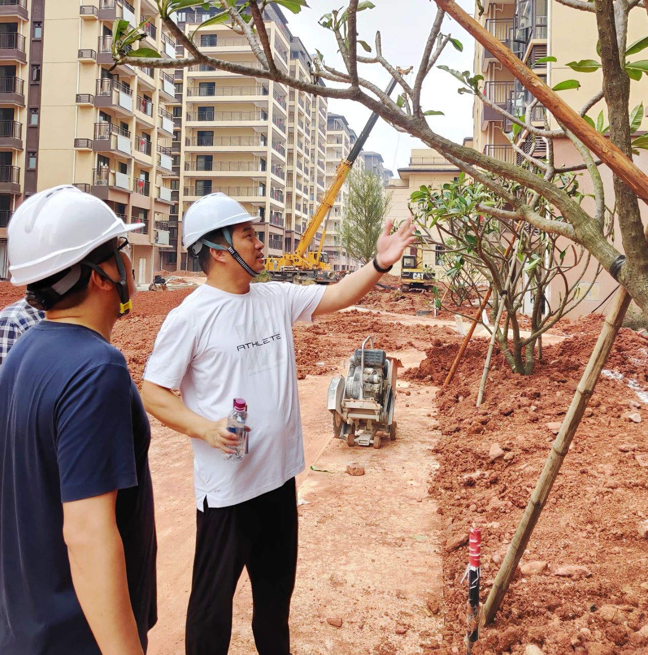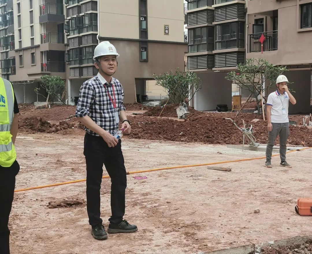 ▲直屬單位裝飾裝修公司黨支部書記、執行董事、總經理尹傳勇在南寧五象智慧健康城項目檢查園林景觀設計工作