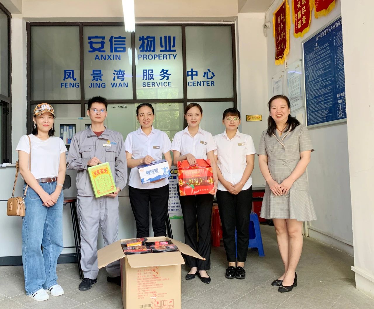 ▲陳莉到安信物業公司長湖·鳳景灣服務中心看望慰問勞動者,并檢查指導工作